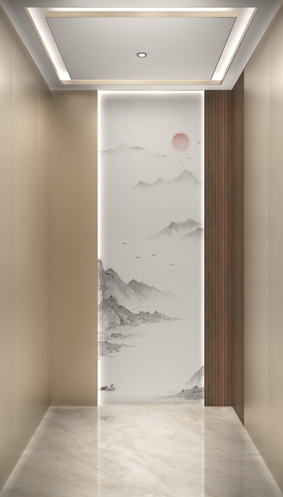 后壁:HSH001禅意水墨,HSM027 黄褐黑檀木(格栅),HSL02201香槟金交叉纹,黑钛不锈钢饰条,灯带。